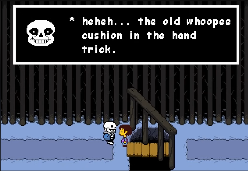 sans put a whoopee cushion on his hand, making it sound like the person who shook his hand had farted.